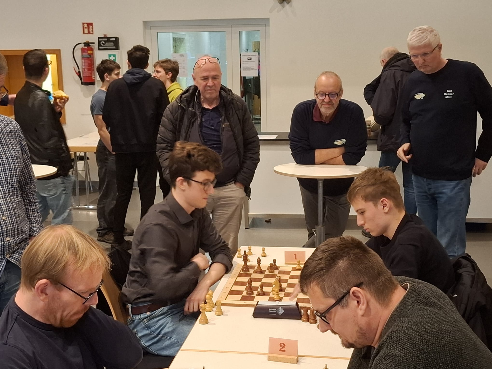 Runde 6: Die beiden Vorsitzenden der Talentschmiede Robert Kaufmann und Thorsten Kammer sowie Waldemar Schmidt verfolgen konzentriert das Duell der letztjährigen Preisträger Ivan Sidletskyi - Isaac Garner. Während Garner als einziger ungeschlagen bleibt und mit 8,0 Punkten souverän das Turnier gewinnt, kommt Sidletskyi mit 6,5 Zählern aufgrund der besseren Buchholzwertung vor FM Schenderowitsch und Tim Ronge als Dritter ins Ziel. An Brett 2 (im Bildvordergrund) treffen mit FM Pawel Grabowski (Rang 7) und Sebastian Send (Rang 12) zwei weitere "Wiederholungstäter" aufeinander. |